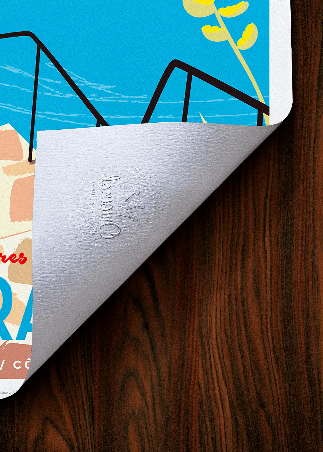 Un gaufrage discret, apposé directement sur le papier, certifie l’origine et la qualité du tirage. Ce sceau inaltérable est une marque d’authenticité.