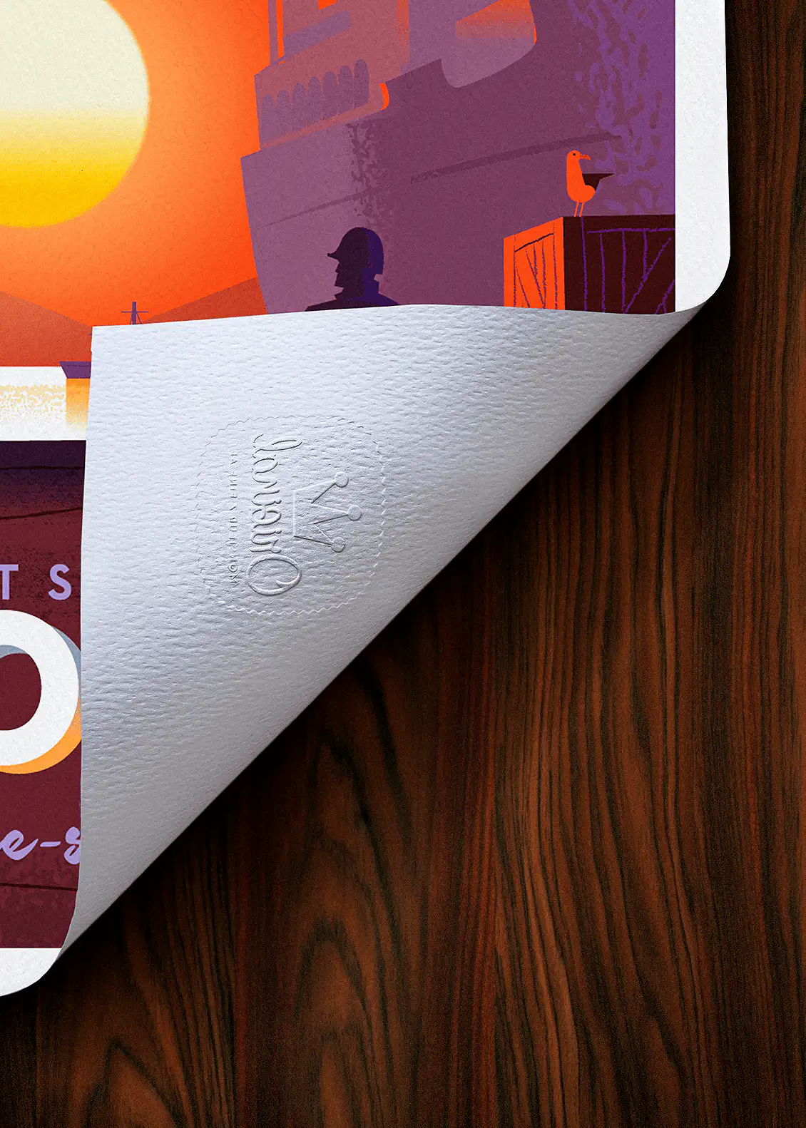 Un gaufrage discret, apposé directement sur le papier, certifie l’origine et la qualité du tirage. Ce sceau inaltérable est une marque d’authenticité.